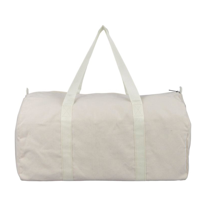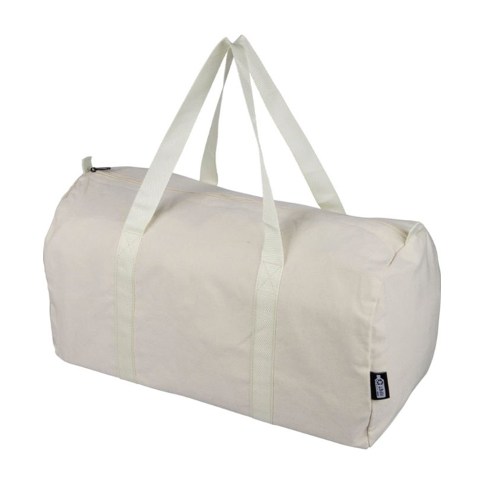 Bolsa deportiva o de viaje de poli algodón reciclado de 330g/m², pensada para desplazamientos y uso diario. Incorpora un compartimento superior amplio con cremallera para mantener el contenido protegido y accesible. Incluye asas largas de 100cm y 3cm de ancho, además de la cremallera a juego para llevarla con comodidad al hombro o en la mano. Con capacidad aproximada de 30 litros, ayuda a organizar ropa, calzado o material de trabajo. Recomendada para acciones de bienvenida, eventos y equipación interna con logo.