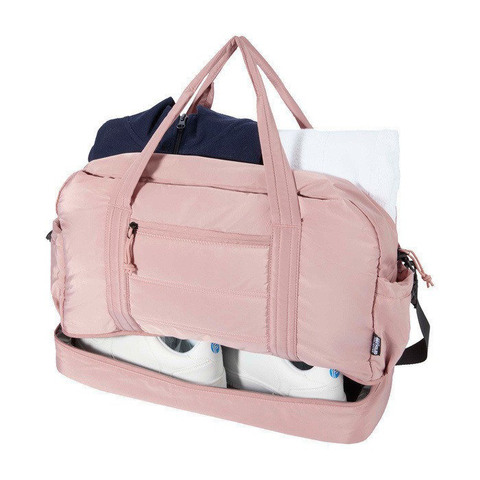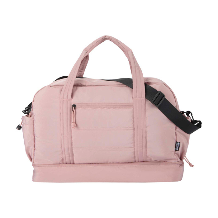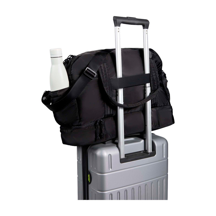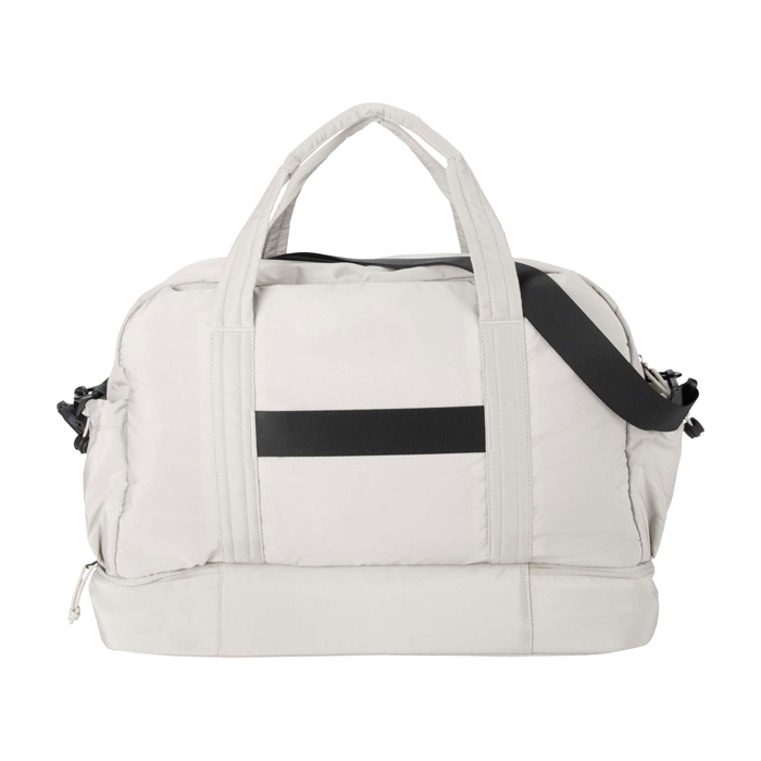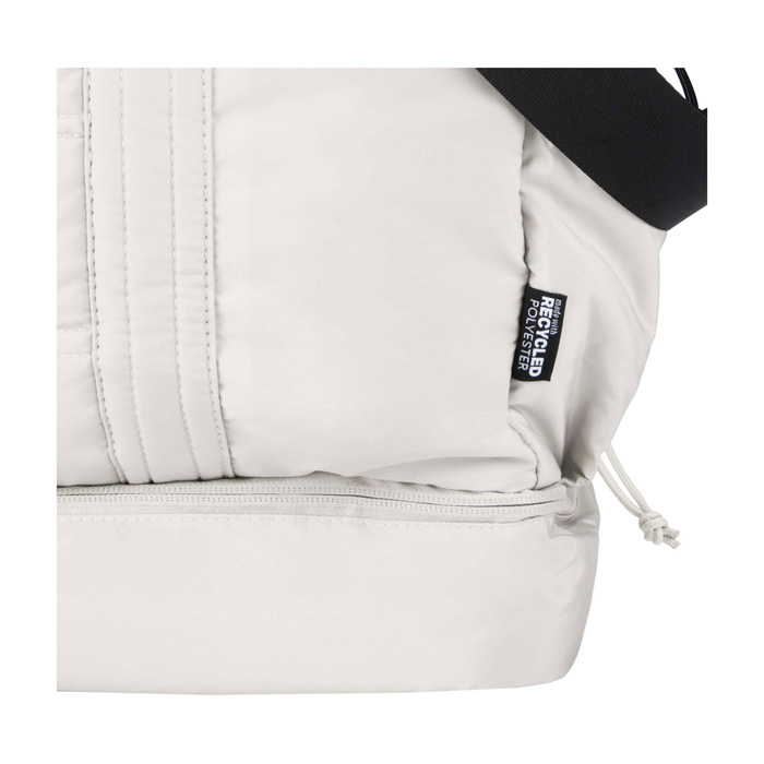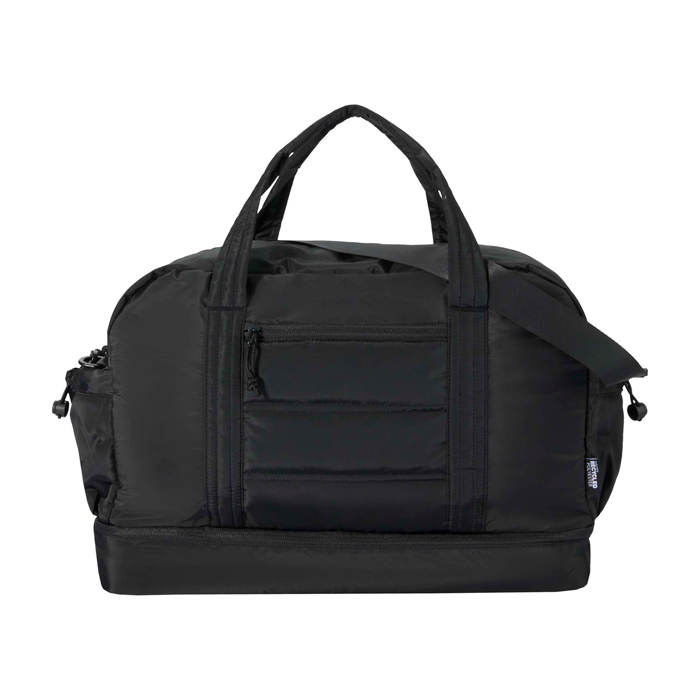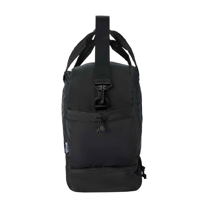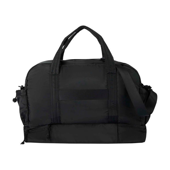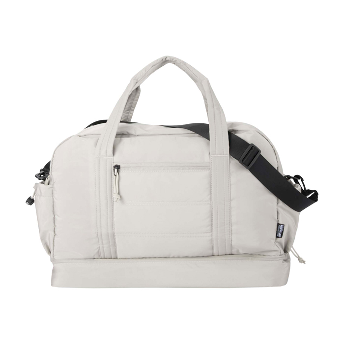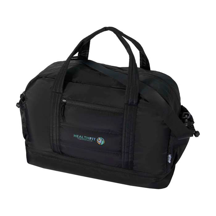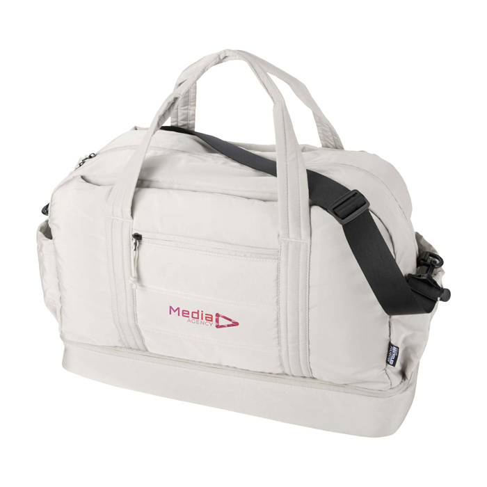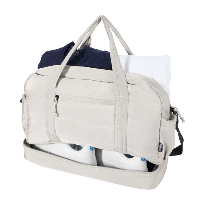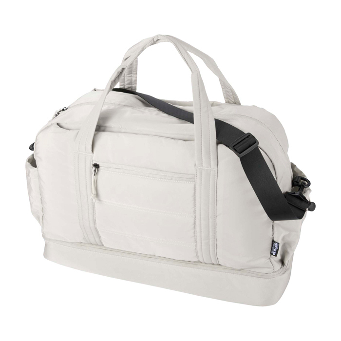 Bolsa de lona de materiales reciclados con Certificación GRS (Global Recycled Standard) pensada para un uso diario exigente. Ofrece 30L de capacidad y un compartimento principal con cremallera para ropa y equipo. Incorpora un compartimento inferior aislado con forro de PEVA (etileno acetato de vinilo) para separar húmedo y seco, además de bolsillos interiores y exteriores para mantener todo ordenado. Incluye asas, correa de hombro ajustable y cinta para acoplarla a la maleta. Recomendable para acciones de RRHH, eventos y viajes corporativos.