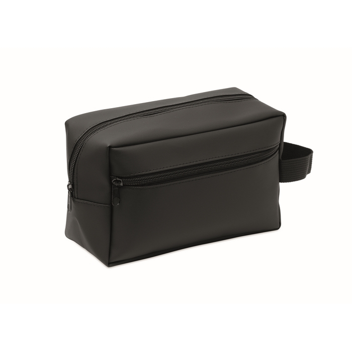 Bolsa neceser de poliéster RPET 600D con revestimiento de PU y forro interior RPET 210D. Incluye un bolsillo frontal con cremallera para separar accesorios pequeños y mantenerlos a mano. El asa facilita el transporte o colgarlo en el baño o en taquillas. Material resistente para uso diario en viajes, gimnasio o desplazamientos de trabajo. Adecuado para personalización como artículo corporativo en packs de bienvenida, kits de eventos o acciones de merchandising.