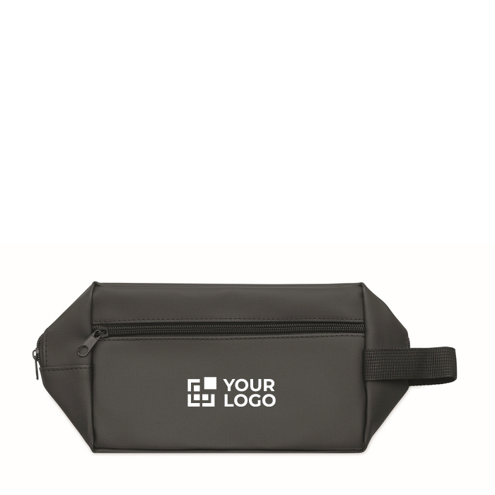 Bolsa neceser con bolsillo frontal y asa para fácil transporte, ideal para personalización en eventos corporativos. Aumenta la visibilidad de tu marca.