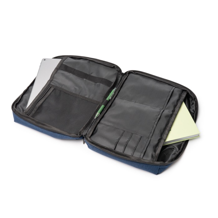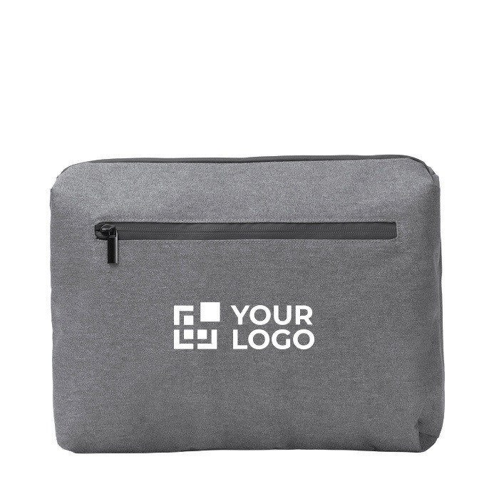 Funda para portátil de plástico reciclado con acabado 300D y detalles en plástico, pensada para equipos de hasta 12". Integra dos compartimentos internos y apertura total para organizar el día a día sin perder tiempo. Las cremalleras y el tejido repelen el agua, útil en desplazamientos y trayectos urbanos. Incorpora bolsillos adicionales medianos y pequeños, un bolsillo de rejilla con cremallera y tiras elásticas para fijar accesorios. Incluye también un bolsillo exterior amplio con cierre. Opción práctica para formaciones, eventos y bienvenida corporativa.