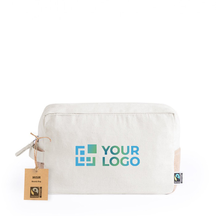 Neceser de 100% algodón, diseñado para ofrecer durabilidad y estilo. El compartimento principal se cierra con una cremallera que incluye un tirador a juego, asegurando un acceso fácil y seguro a su contenido. Los laterales y la base están reforzados con yute, proporcionando resistencia adicional. Incluye una etiqueta Fairtrade (Comercio Justo) y una etiqueta con logotipo en cartón reciclado, subrayando su compromiso con la sostenibilidad. La certificación Fairtrade garantiza prácticas éticas en su producción. Ideal para empresas que buscan promover valores de sostenibilidad y responsabilidad social en sus campañas corporativas o de marketing.