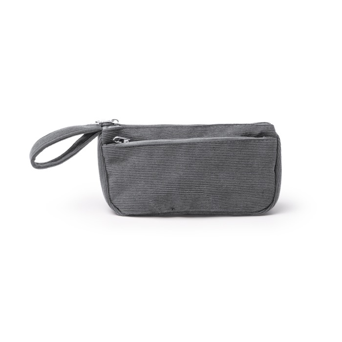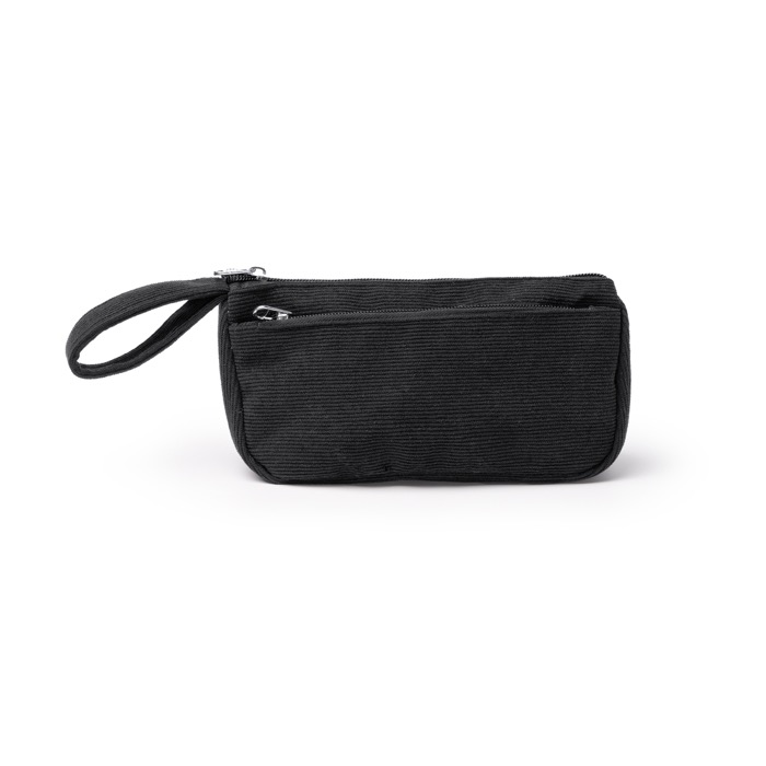 Neceser de pana con forro interior resistente, pensado para organizar artículos de higiene o pequeños accesorios en viajes y en el día a día. Incluye un compartimento principal amplio y un bolsillo frontal independiente, ambos con cierre de cremallera y tiradores metálicos para un uso cómodo. El asa de mano, fabricada en el mismo material, facilita el transporte y el acceso rápido. Opción práctica para personalizar y utilizar en acciones de bienvenida, ferias o merchandising corporativo.