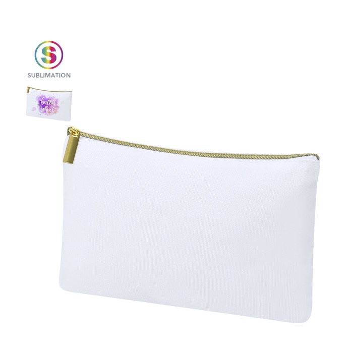 Neceser de poliéster con compartimento principal y cierre de cremallera dorada, rematado con tirador a juego para un uso cómodo en el día a día. El diseño está pensado para sublimación, facilitando personalizaciones nítidas y constantes en producciones corporativas. Formato práctico para guardar accesorios, material de viaje o pequeños esenciales de oficina, manteniendo el contenido ordenado y accesible. Opción útil para acciones de marca en ferias, formaciones internas o como detalle en campañas de fidelización.