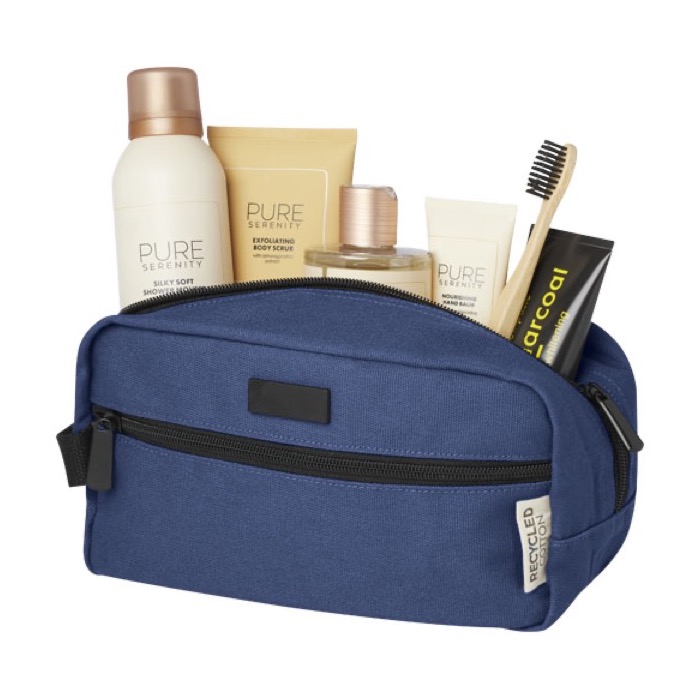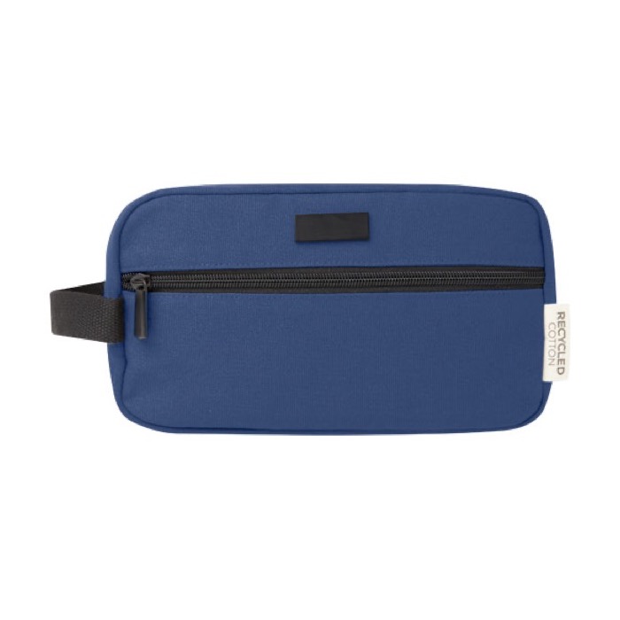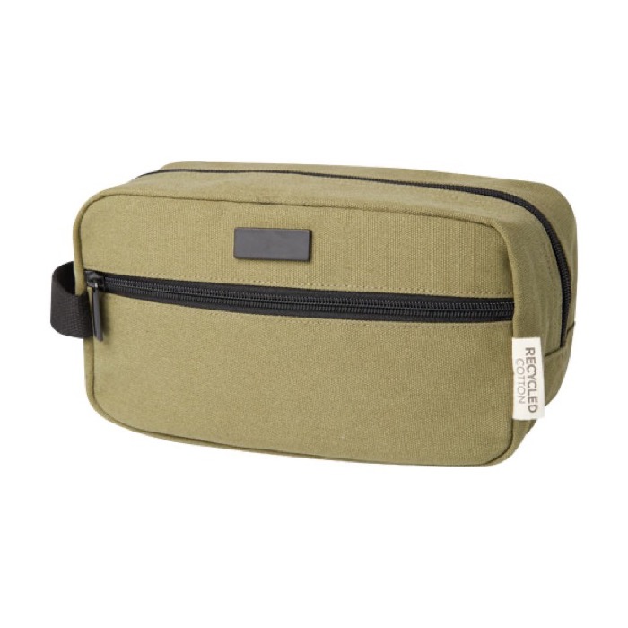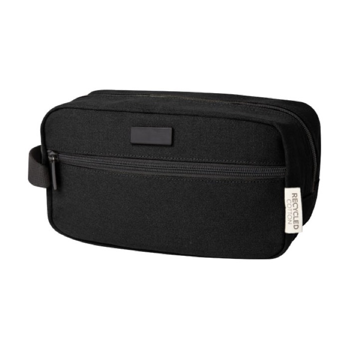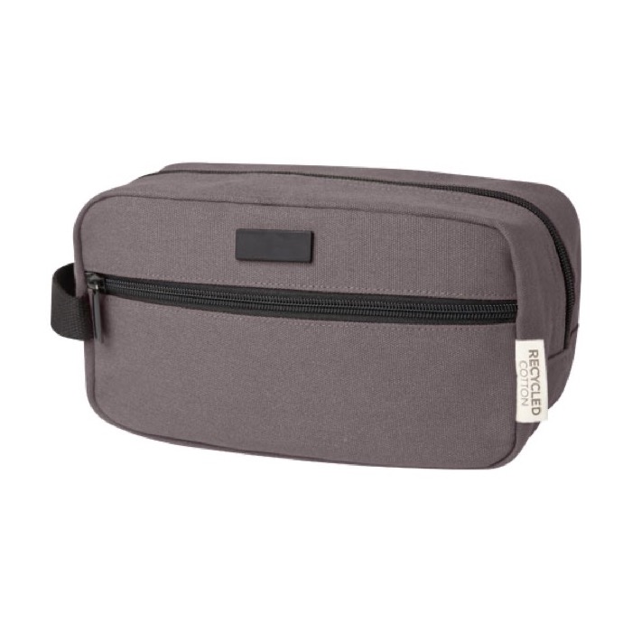 Neceser de viaje fabricado en lona reciclada con certificación GRS (Global Recycled Standard), complementado con un forro de RPET (tereftalato de polietileno reciclado) también certificado. Diseñado para la practicidad, cuenta con un bolsillo frontal y un compartimento principal con cremallera, además de bolsillos organizadores internos y una correa para facilitar su transporte. La placa metálica decorativa es ideal para destacar el logotipo de su empresa. Con una capacidad de 3,5 litros y un gramaje de 330 g, este neceser es una opción sostenible y funcional. Perfecto para empresas que buscan promocionar su marca de manera ecológica en eventos corporativos o como parte de un kit de bienvenida para empleados.
