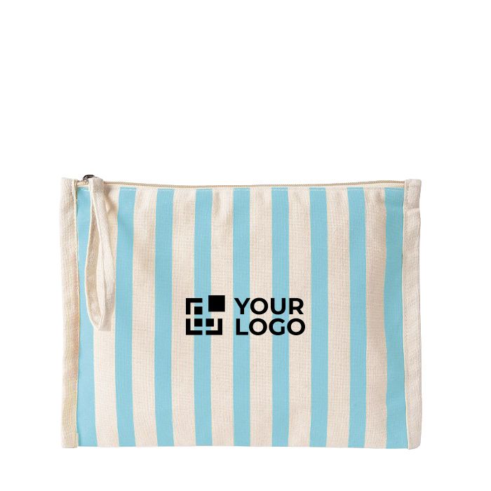 Neceser de algodón reciclado de 180 g/m². Incorpora un tirador tipo pulsera que facilita llevarlo en la mano o colgarlo rápidamente durante desplazamientos. Su formato ayuda a mantener ordenados artículos de aseo, cables, material de oficina o pequeños accesorios de trabajo. Superficie adecuada para personalización con el logo, útil en acciones de bienvenida, eventos, formaciones o como detalle para empleados y clientes.