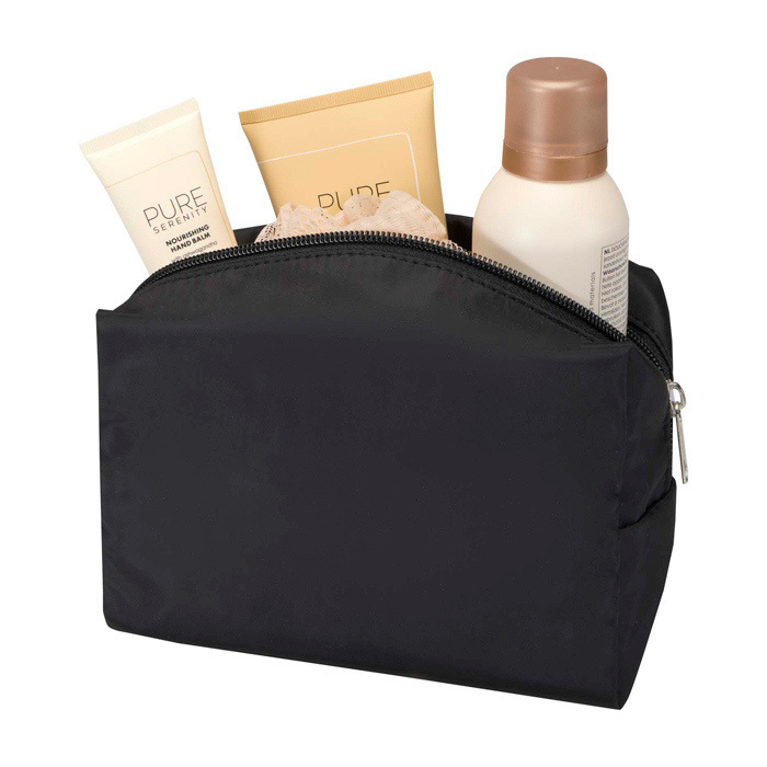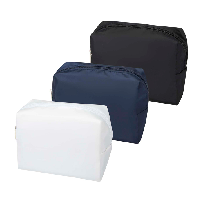 Neceser de viaje fabricado en poliéster reciclado con certificado GRS (Global Recycled Standard), pensado para organizar lo imprescindible en desplazamientos y eventos. El formato compacto ayuda a llevar cepillo de dientes, pasta dentífrica, champú y otros artículos pequeños sin mezclarlo con el resto del equipaje. Incorpora cierre de cremallera y un asa para moverlo con rapidez o colgarlo en el baño. Una opción útil para acciones de bienvenida a empleados, congresos o campañas de marca con personalización.
