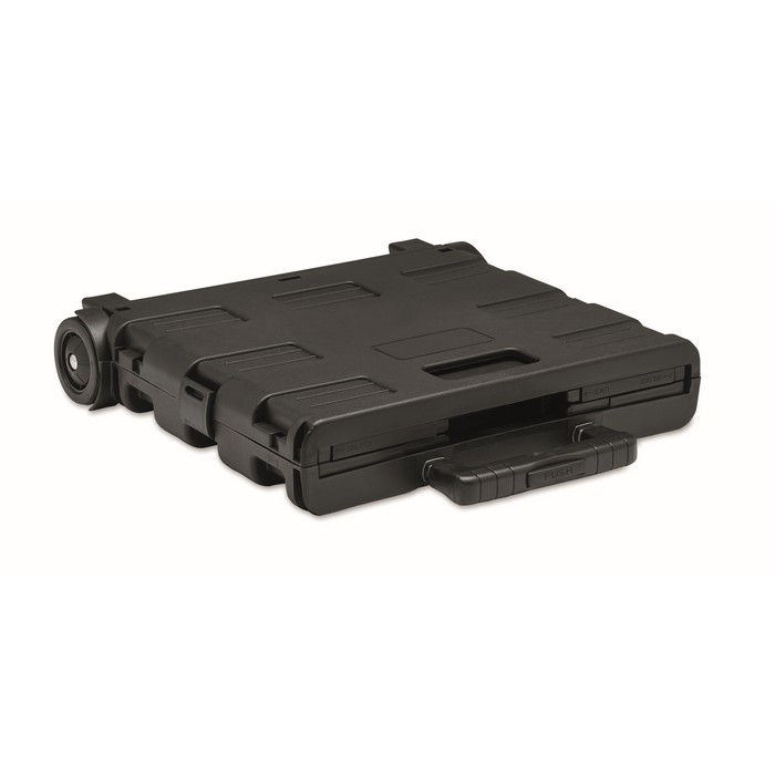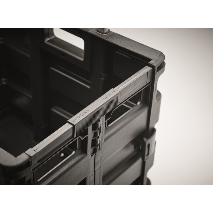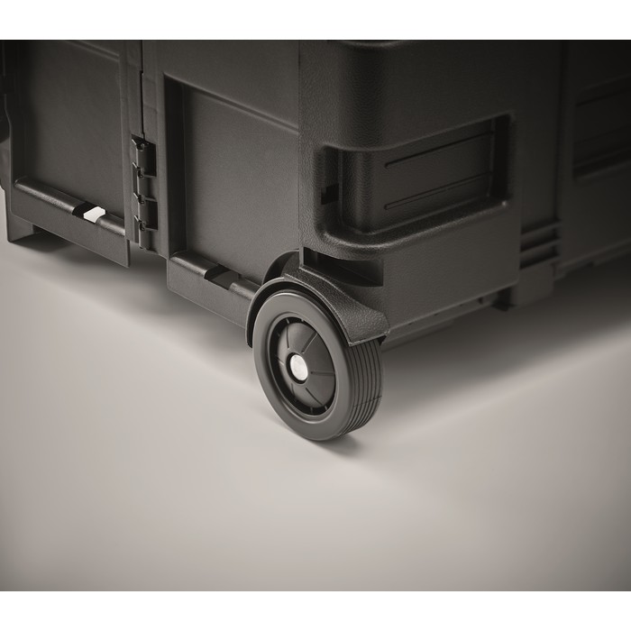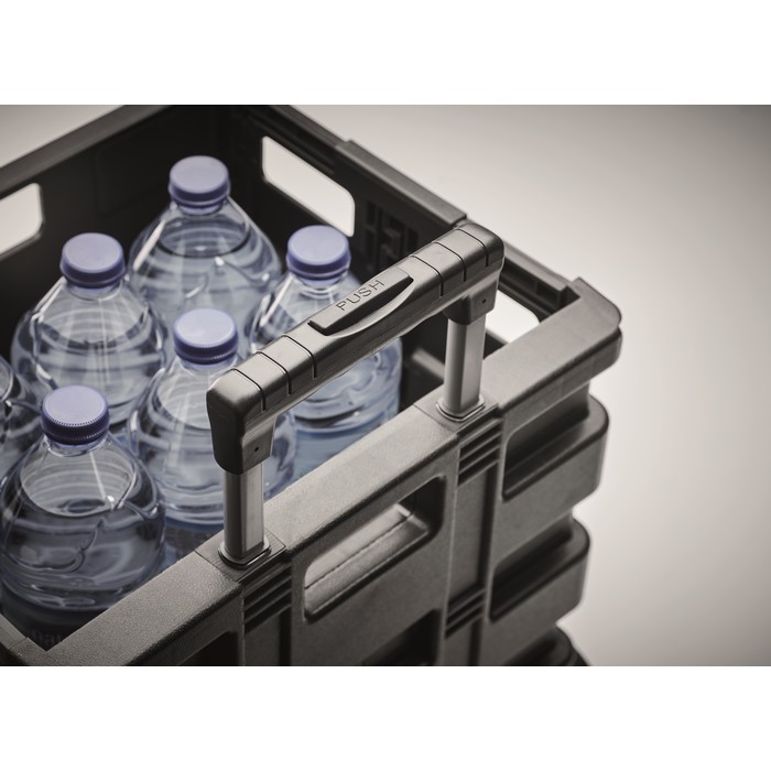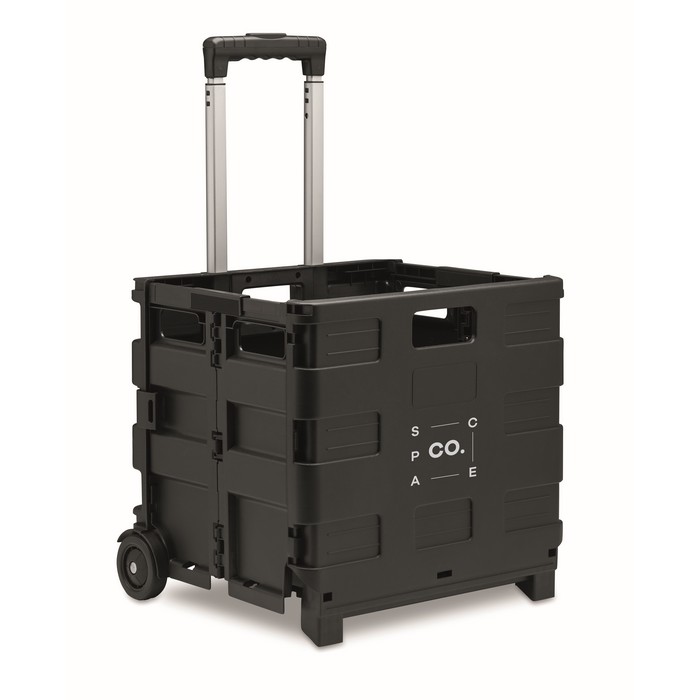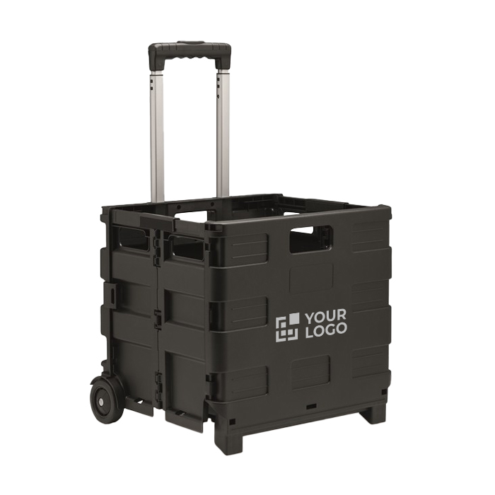 Un carro de compras plegable que puede ser la solución a tus problemas de transporte para cargas pesadas. Y es que soporta hasta 25 kg de peso, tiene una capacidad útil de 32 litros y cuenta con dos ruedas para un arrastre más sencillo, lo que te permitirá desplazar de forma cómoda y segura productos pesados u objetos de almacén. Está fabricado en plástico PP y su asa extensible es de acero con agarre de plástico. Se puede personalizar con logo mediante tres técnicas de marcaje: serigrafía, etiqueta digital y gota de resina.