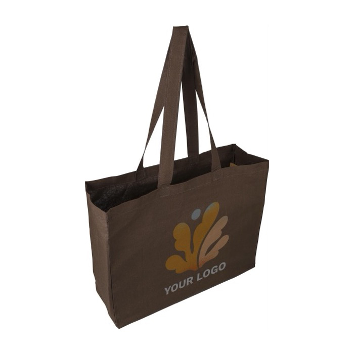 Bolsa de algodón con refuerzo lateral de 13 cm para ganar capacidad sin perder comodidad. Incorpora asas largas de 67 cm, pensadas para llevarla al hombro en ferias, oficinas o desplazamientos diarios. El tejido de 180 g/m² ofrece un tacto consistente y una buena presencia para acciones de marca. Incluye etiqueta con certificado Oeko-Tex® (estándar de seguridad textil) para reforzar la confianza en el material. Opción práctica para merchandising corporativo y eventos con logotipo.