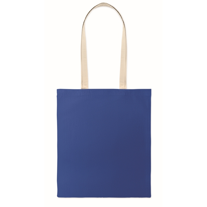 Bolsa de compra de algodón de 140 g/m², con asas largas en color natural y cuerpo en contraste para diferenciar el diseño. Ofrece un formato práctico para el día a día y un tejido ligero que facilita el transporte cuando va vacía. Las asas permiten llevarla al hombro con comodidad, incluso en trayectos largos. Adecuada para acciones de merchandising, packs de bienvenida, ferias y entrega de documentación o material corporativo.