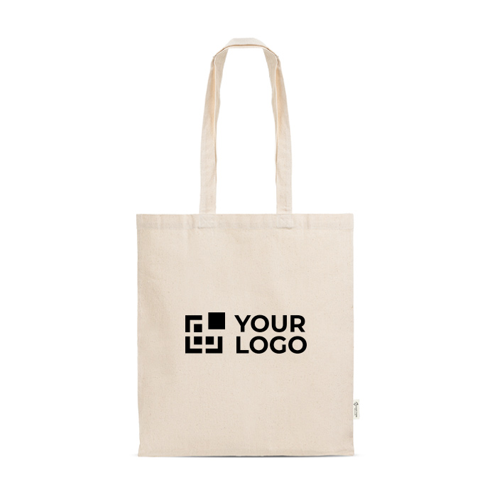 Bolsa de compras de algodón reciclado y plástico reciclado de 180 g/m², pensada para el uso diario con un acabado ligero y resistente. Incorpora asas largas para llevarla al hombro con comodidad y facilita el transporte de documentos, catálogos o compras. Soporta hasta 9kg, por lo que encaja bien en jornadas de oficina, ferias o acciones de calle. Superficie adecuada para personalización y visibilidad de marca en entregas, eventos corporativos o campañas de fidelización.