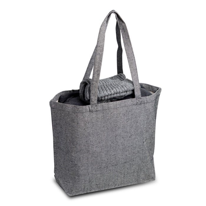 Bolsa de algodón reciclado de 280 g/m² con fuelle. Fabricada con algodón reciclado, esta bolsa es una solución ecológica que promueve la reutilización y ayuda a mantener un entorno más limpio. Sus amplias dimensiones de 50 x 35 x 16 cm ofrecen un espacio generoso para transportar compras, objetos personales o cualquier otro artículo necesario. Disponible en colores caqui y negro, se adapta fácilmente a diferentes estilos y necesidades corporativas. Las asas largas facilitan su transporte, mientras que la certificación Global Recycled Standard (GRS) asegura que cumple con los más altos estándares de calidad y sostenibilidad. Ideal para empresas que buscan opciones sostenibles para merchandising o eventos corporativos.