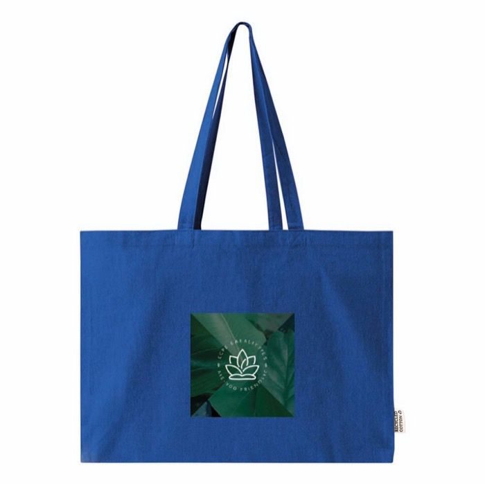 Bolsa de algodón reciclado de 220 g/m² con asas largas oversize para llevarla cómodamente al hombro. Incorpora fuelle, lo que aporta más capacidad y mejor estabilidad al transportar catálogos, ropa o material de oficina. El tejido ofrece un tacto consistente y una presencia cuidada para acciones de marca. Soporta hasta 9 kg, pensada para un uso repetido en el día a día. Opción práctica para ferias, eventos corporativos y entregas en punto de venta con tu logo.