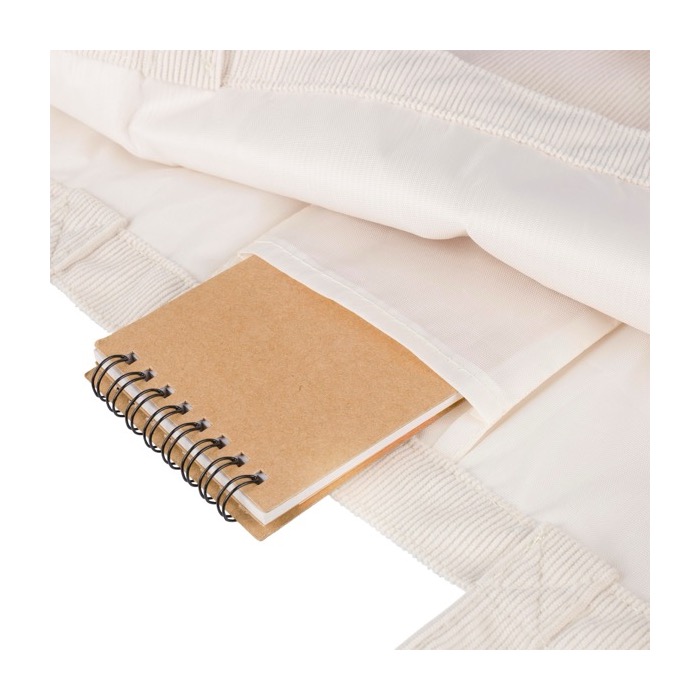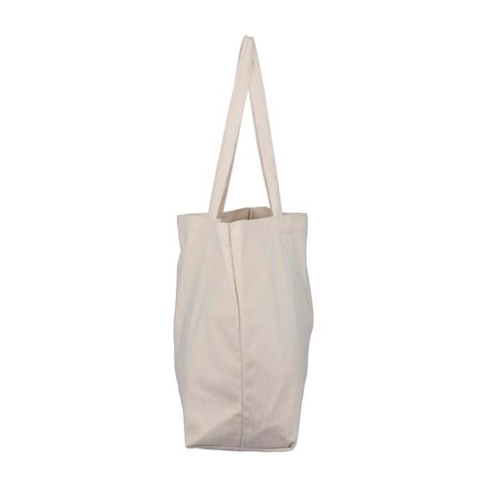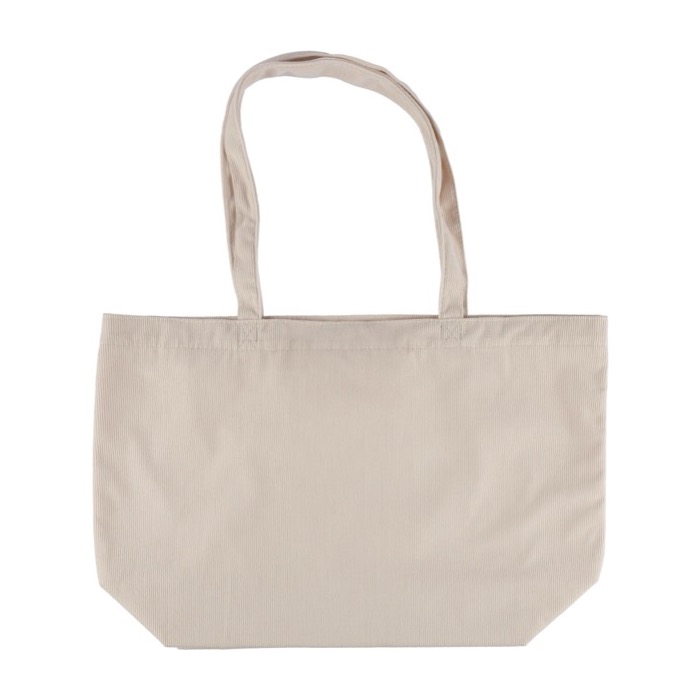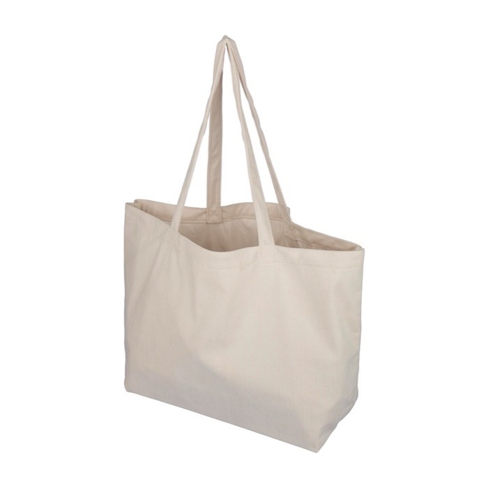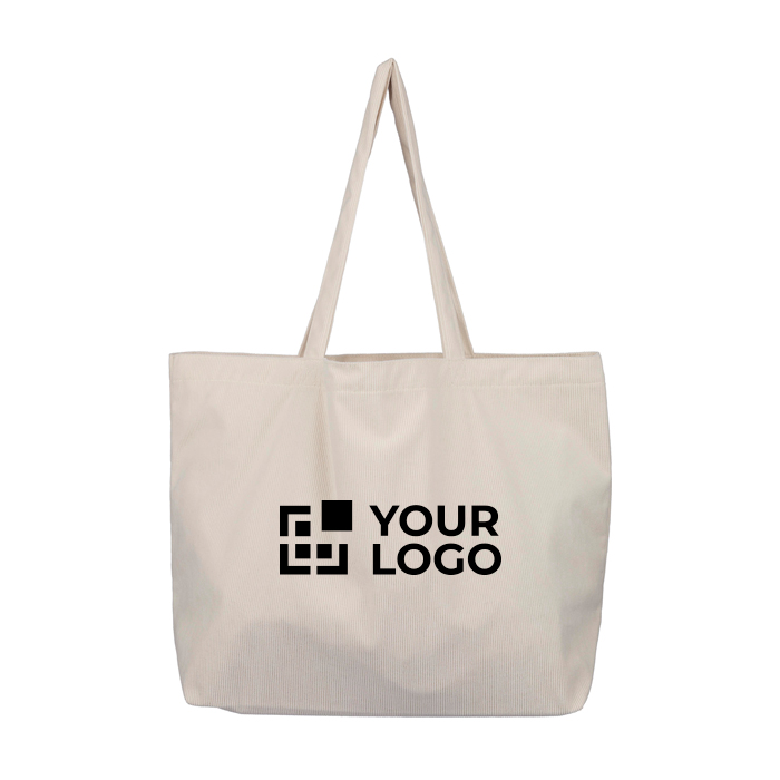 Lleva tu marca allá donde vayas con una bolsa de pana con asas largas, compartimento amplio y bolsillo interior, pensada para ordenar y acompañarte.
