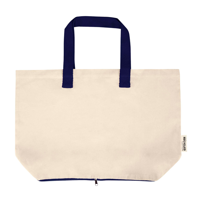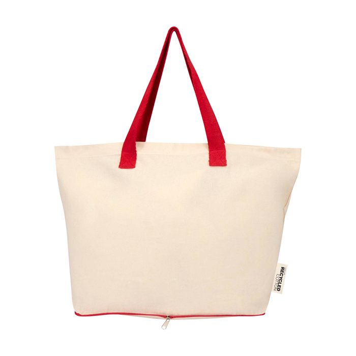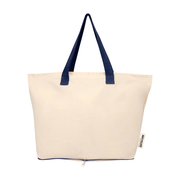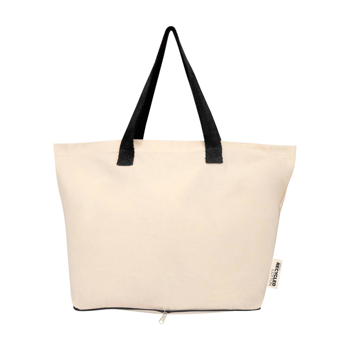 Bolsa tote plegable de algodón 100% reciclado con certificado GRS (Global Recycled Standard) de 140 g/m², pensada para el uso diario con buena resistencia y manejo cómodo. Se pliega dentro de su propia funda con cremallera situada en la parte inferior, ocupando poco espacio para llevarla en bolso, coche o maleta. Incorpora asas dobles para un agarre más seguro al transportar peso y soporta hasta 10 kg. Capacidad de 7 litros. Recomendable para acciones de marca en ferias, compras corporativas o bienvenida de empleados.