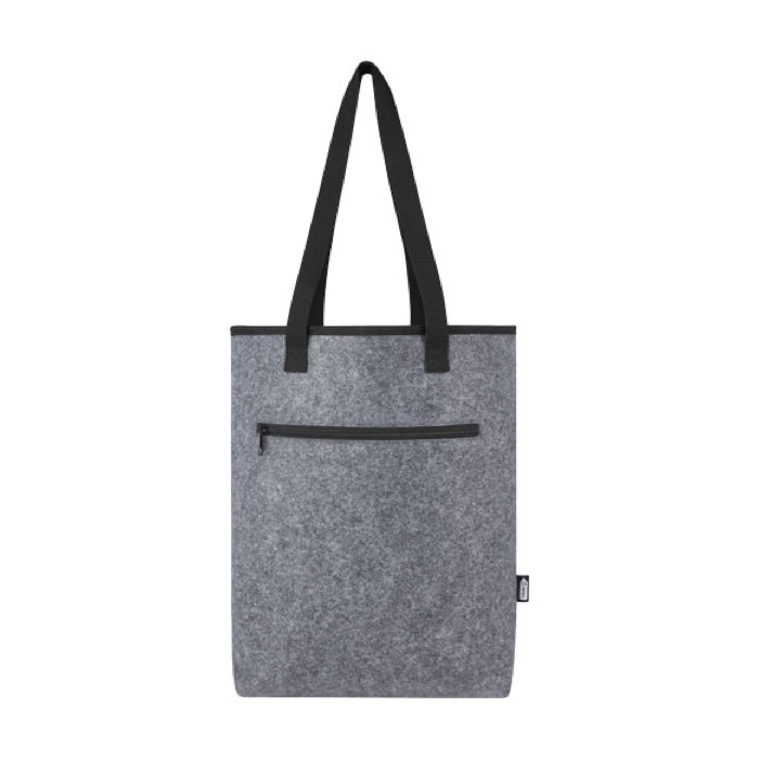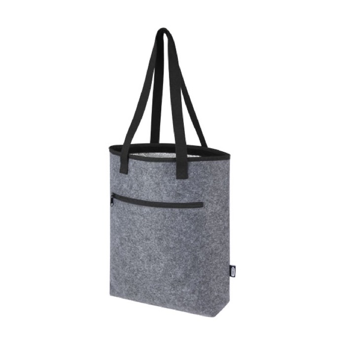 Bolsa isotérmica de fieltro reciclado con Certificado Global Recycled Standard (GRS). Diseñada para mantener la temperatura de los productos, cuenta con un compartimento principal aislado y cierre de velcro. Las asas largas de algodón facilitan su transporte, mientras que el fondo extra ancho ofrece mayor capacidad y estabilidad, con un volumen total de 12,000 ml. Un práctico bolsillo frontal con cremallera permite guardar objetos pequeños de forma segura. Sin embalaje individual, este producto es ideal para empresas que buscan soluciones sostenibles. Perfecta para personalizar con el logotipo de tu empresa y utilizar en eventos corporativos o como regalo promocional.