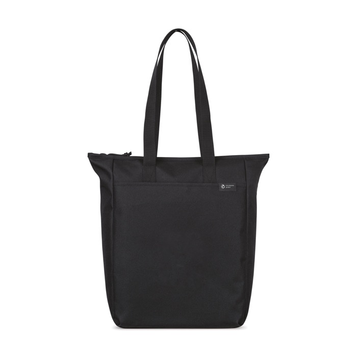 Bolsa tote moderna y sostenible fabricada con tela reciclada y correas procedentes de botellas de plástico. Ofrece un amplio compartimento principal con cierre de cremallera, asegurando que el contenido permanezca seguro. Incluye un bolsillo frontal de fácil acceso y varios bolsillos interiores con cremallera, ideales para organizar accesorios y objetos personales. El interior cuenta con el sistema de identificación virtual y pasaporte de producto AWARE™. Este sistema permite rastrear y validar el origen de los materiales reciclados mediante un código QR único. Además, el material de poliéster reciclado es antigoteo, proporcionando una protección adicional. Perfecta para empresas que buscan soluciones sostenibles y prácticas para el transporte de documentos o materiales promocionales.
