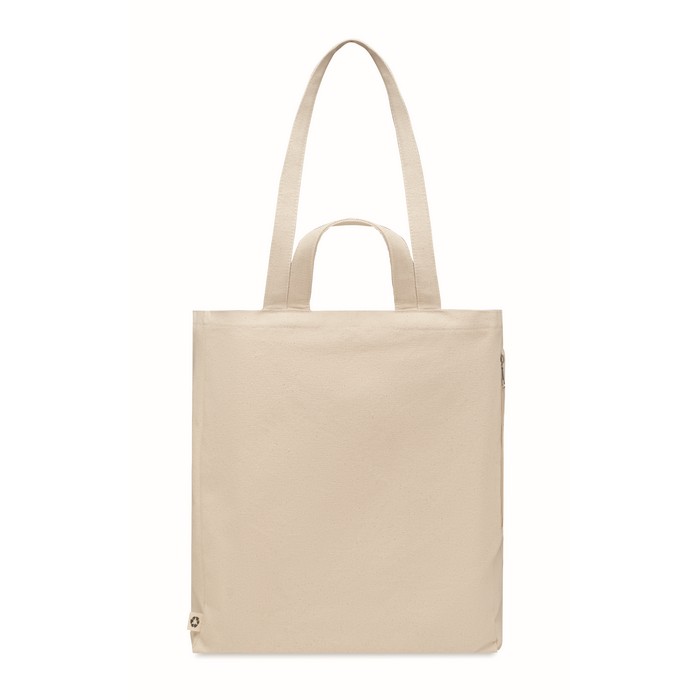 Bolsa de compra o de playa fabricada en poli algodón reciclado, compuesta por un 70% de algodón reciclado y un 30% de poliéster reciclado. Diseñada con asas cortas para un transporte cómodo, esta bolsa incluye un práctico bolsillo lateral con cremallera, ideal para guardar objetos pequeños de forma segura. Con un gramaje de 380 gr/m², ofrece una estructura resistente y duradera. Además, cuenta con un servicio Express para entregas rápidas. Su composición sostenible la convierte en una opción responsable para empresas que buscan reducir su impacto ambiental. Perfecta para eventos corporativos o como parte de una estrategia de marketing ecológica.