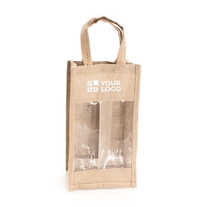 Sorprende a tus clientes con esta elegante bolsa de yute laminado, diseñada específicamente para transportar dos botellas de vino de 75 cl. Cuenta con una robusta estructura y asas medianas reforzadas. La ventana transparente permite una visualización rápida del contenido. Los ribetes realzan su atractivo, haciéndola destacar más. Es apta para personalización a pocos colores. Sin embalaje individual, esta opción es más sostenible y práctica y una forma mejor presentada de regalar botellas de vino.