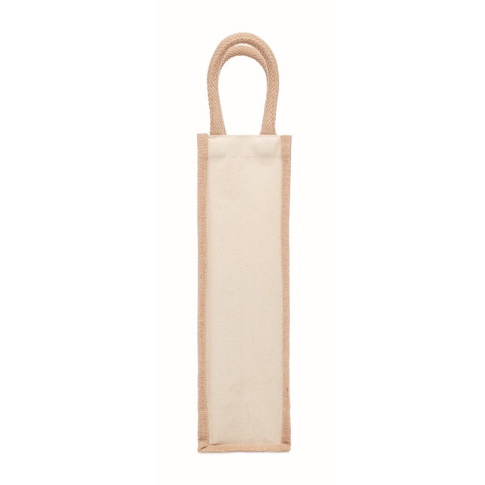 Bolsa de yute y canvas para regalar botellas de vino. Es de 320 g/m2, alto, lo cual le da solidez al objeto para que se sienta como un producto de calidad, facilitando así que perciban tu regalo como algo exclusivo. Es de asas cortas, pero robustas, pudiéndola llevar cómodamente en la mano. Este es un artículo de bajo precio, pero que potenciará el valor de tu próximo regalo. Asimismo, el servicio de transporte exprés está habilitado, por si quieres recibir tu pedido en menos días.