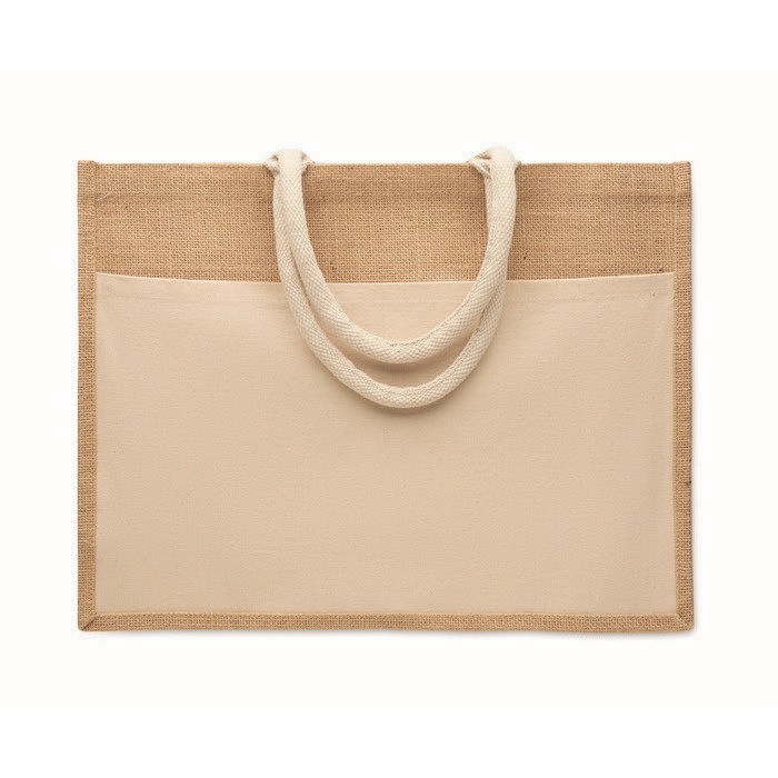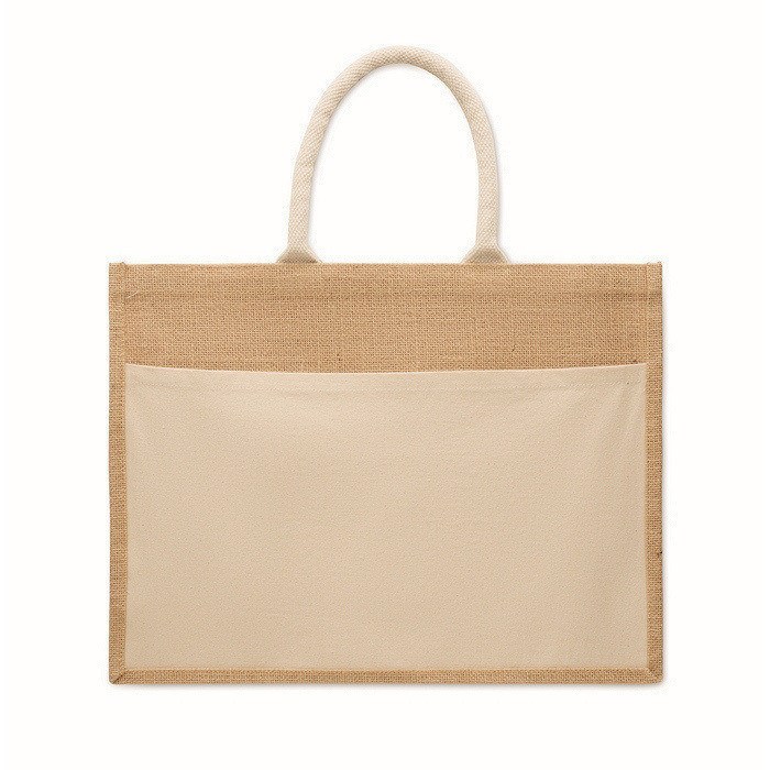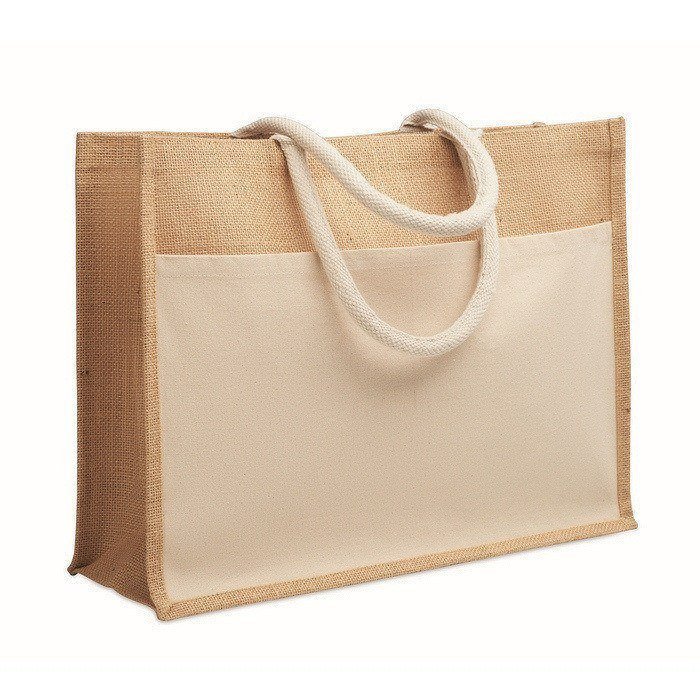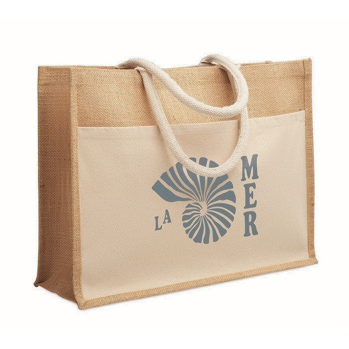 Bolsa de compra o playa de yute laminado y lona de algodón de 280 g/m², pensada para un uso diario y repetido. Combina un cuerpo resistente con asas de cordón para un agarre cómodo en mano o al hombro. Incorpora un gran bolsillo frontal abierto, práctico para guardar documentos, folletos o artículos pequeños que conviene tener a mano. Por su tamaño y construcción, resulta adecuada para ferias, entregas de bienvenida o acciones de merchandising en punto de venta.