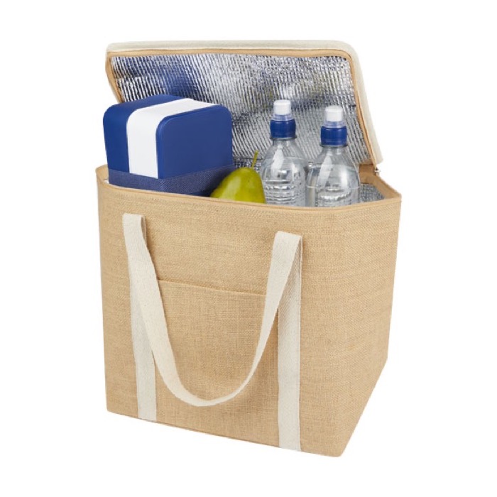 Bolsa isotérmica de yute laminado, con una capacidad de 19 litros, ideal para mantener la temperatura de los productos. Su compartimento principal es amplio y cuenta con un aislamiento grueso, permitiendo almacenar hasta seis botellas de 1,5 litros. El cierre de cremallera asegura un acceso fácil y seguro, mientras que el bolsillo frontal ofrece espacio adicional para pequeños artículos. Las asas de hombro facilitan su transporte. Fabricada en India, esta bolsa es robusta y duradera. Sin embalaje individual, su gramaje es de 300 g. Con servicio Express disponible, es perfecta para empresas que buscan soluciones prácticas para eventos corporativos o promociones de marca.