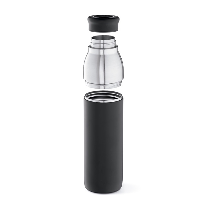 Cuida la hidratación diaria de tus equipos con esta botella/vaso de acero inoxidable reciclado de 760 ml. Incluye dos tapas diferentes, lo que permite usarla como botella o como taza de viaje, adaptándose a distintas situaciones. Por su estructura, mantiene la temperatura de tus bebidas por más tiempo. Se entrega en una elegante caja de papel kraft. Además, es personalizable tanto con tu logo a color como con grabado láser, dependiendo del resultado que busques. Un best-seller que puede estar en pocos días en tus oficinas gracias a nuestro servicio exprés.