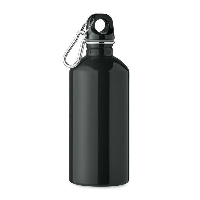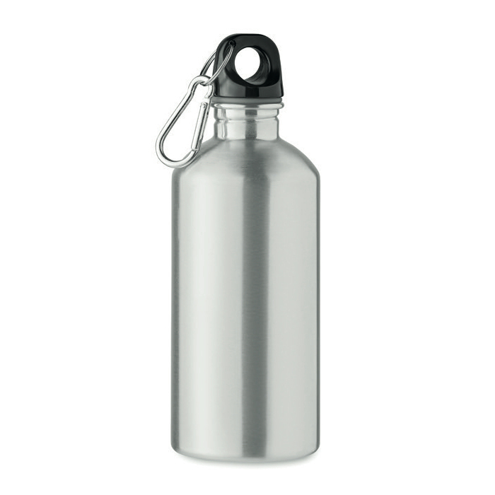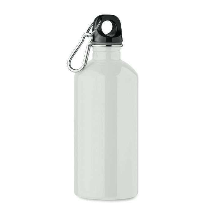 Botella de pared simple de acero inoxidable reciclado (90% reciclado y 10% acero inoxidable) con capacidad de 500 ml y mosquetón para engancharla a mochilas o bolsos. Diseño antifugas y antigoteo para evitar derrames en desplazamientos y uso diario. La impresión por sublimación (marcaje a todo color por transferencia térmica) está disponible solo en el modelo blanco. Al ser de una sola pared, puede transmitir el calor de la bebida al exterior. Opción práctica para kits de bienvenida, eventos y acciones de marca.