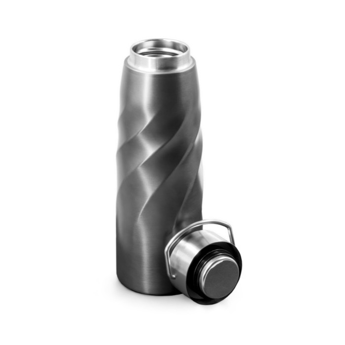 Botella de viaje con termo al vacío fabricada con acero inoxidable 304 reciclado. Su diseño elegante y tapa de rosca a prueba de fugas garantizan un uso sin preocupaciones. La forma ergonómica facilita su manejo, mientras que el aislamiento Coppertech© asegura que las bebidas heladas se mantengan frías hasta 3 días, las frías durante 48 horas y las calientes durante 24 horas. Con una capacidad de 500 ml, es ideal para quienes necesitan una solución portátil y funcional. La correa en la tapa añade comodidad al transportarla. Perfecta para empresas que buscan productos sostenibles y de alta calidad para sus empleados o como regalos corporativos.