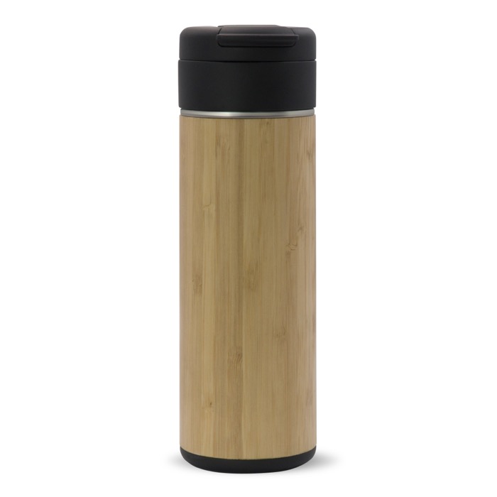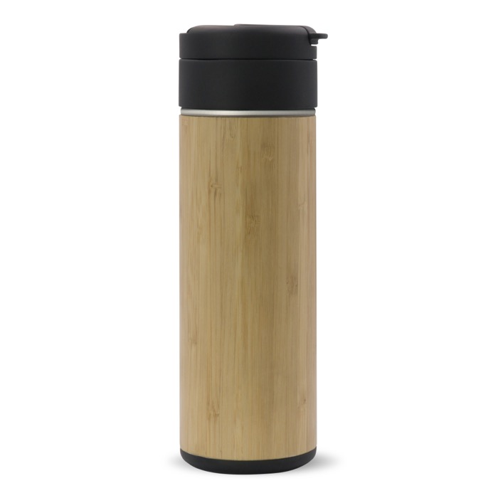 Botella de doble pared con aislamiento al vacío, fabricada en acero inoxidable de alta calidad, ideal para mantener la temperatura de tus bebidas. El acabado de bambú en la taza le da un toque elegante y natural, mientras que la tapa abatible garantiza que sea 100% libre de fugas, facilitando su transporte. Con una capacidad de 400 ml, esta botella térmica es perfecta para mantener tus bebidas calientes hasta 12 horas o frías hasta 24 horas. Su diseño antigoteo la hace ideal para llevar en cualquier situación. Perfecta para reuniones corporativas o como regalo promocional en eventos empresariales.