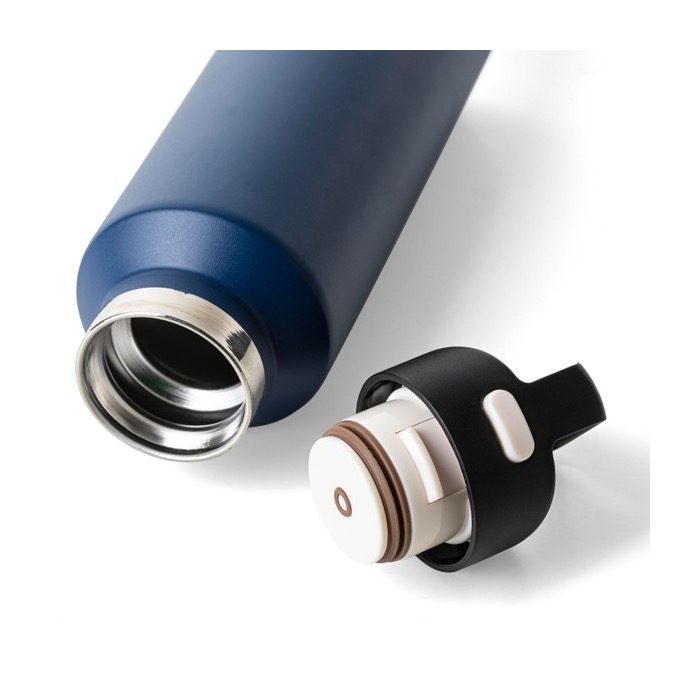Botella de acero inoxidable reciclado con doble pared y capacidad de 600ml, pensada para un uso diario intensivo en oficina y desplazamientos. Combina interior en acero inoxidable 304 y exterior en acero inoxidable 201 para un buen equilibrio entre resistencia y acabado. La tapa de plástico incluye anilla de transporte y apertura con pulsadores laterales: se desbloquea presionando ambos y se cierra hasta oír un clic para mayor seguridad. Se entrega en caja individual de cartón marrón, útil para acciones de empresa y eventos.