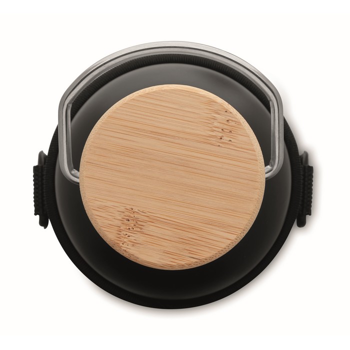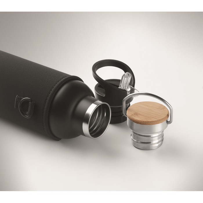 Botella de acero inoxidable de doble pared aislado al vacío, diseñada para mantener la temperatura de tus bebidas por más tiempo. Incluye un tapón de rosca anti fugas con un elegante acabado de madera y un tapón adicional con boquilla intercambiable para mayor versatilidad. Se acompaña de una práctica bolsa de transporte de neopreno, facilitando su manejo y protección. Con una capacidad de 700 ml, es apta para lavavajillas, lo que simplifica su limpieza. Su función térmica y diseño antigoteo la hacen ideal para el uso diario. Perfecta para empresas que buscan un artículo promocional funcional y personalizable, ideal para eventos corporativos o como regalo para empleados.