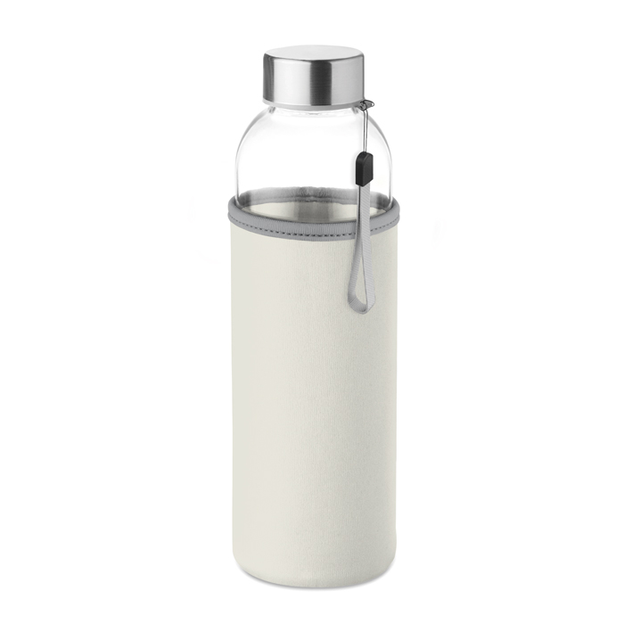 Botellas de cristal, ideal para negocios como gimnasios o centros deportivos, siendo perfecta para regalar a nuevos socios o en eventos corporativos de la marca (e, incluso, en actos relacionados a los cuales acudas), ofreciendo un recipiente que utilizarán en el día a día y facilitando así que la compañía tenga una gran visibilidad. La capacidad es de 500 ml, lo habitual para esta clase de accesorios. La tapa incorpora una pequeña correa para poder sujetarla mejor. Esta botella, una de las más vendidas, lleva una funda de neopreno que cubre parte de la superficie, permitiendo así un mejor agarre de la misma y pudiendo elegirla en una amplia variedad de colores, pudiendo ajustarse así al tono corporativo y que, además, esté bien combinado con el logotipo, facilitando que la persona que lo reciba asocie este producto a la empresa que se lo entregó.