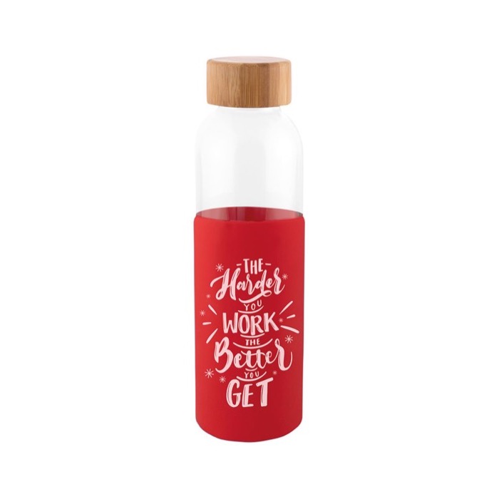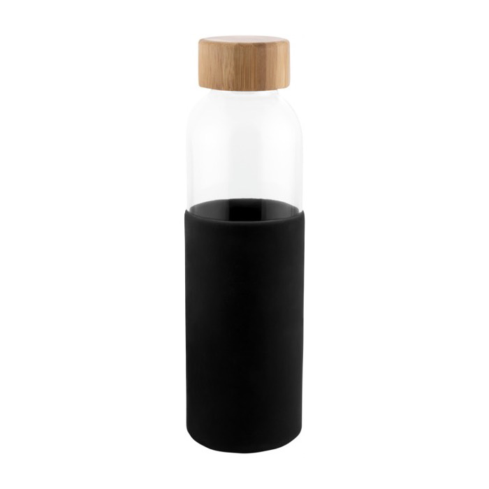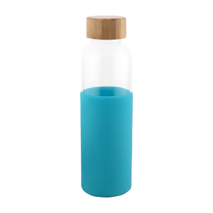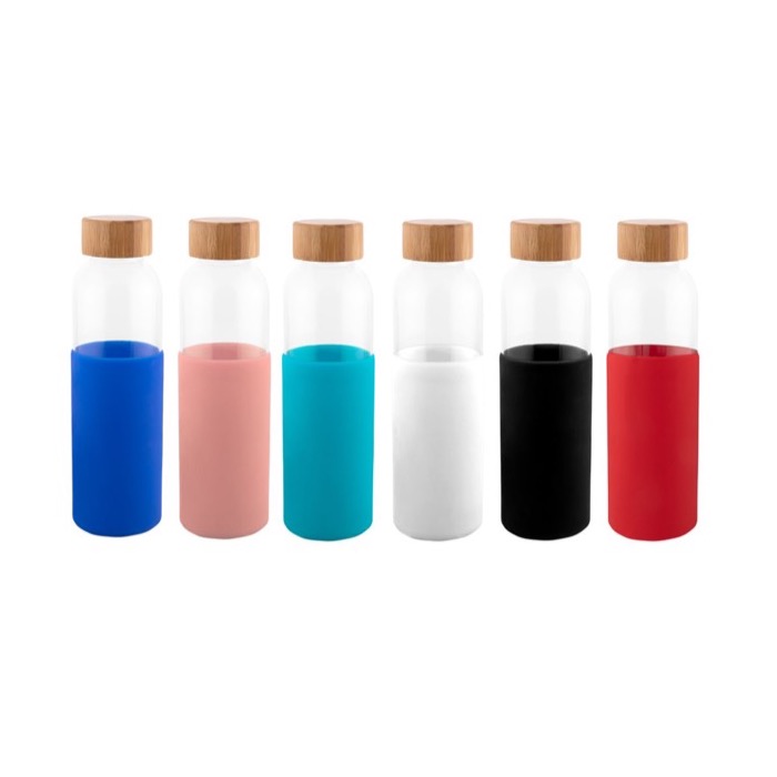 Botella de cristal con tapón de bambú, diseñada para una capacidad de 500 ml. Incluye una funda de silicona que mejora la resistencia y proporciona un agarre seguro. Cada botella se entrega en una caja individual, lo que facilita su distribución y almacenamiento. Ideal para empresas que buscan un producto de merchandising corporativo elegante y funcional. Perfecta para promociones, eventos o como regalo para clientes y empleados, destacando el compromiso de la empresa con la sostenibilidad y el diseño moderno.