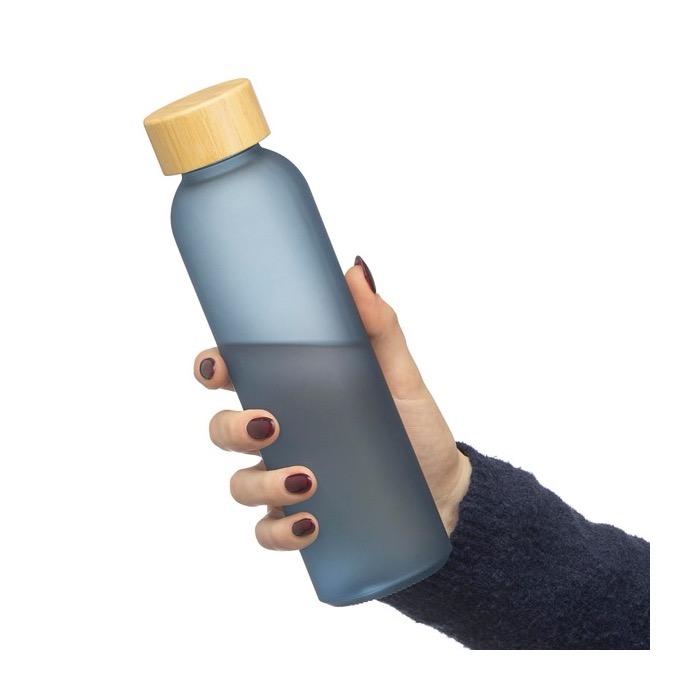 Botella de vidrio sódico-cálcico con cuerpo revestido glaseado y tapa de rosca de bambú con interior de plástico (PP). Capacidad de 500ml, pensada para bebidas frías y para un uso diario en oficina, reuniones o zonas de recepción. El acabado exterior mejora el agarre y ayuda a diferenciarla frente a botellas estándar. Se entrega en caja de presentación individual de cartón marrón, lista para almacenar o preparar envíos internos. Opción práctica para acciones de marca en eventos y como detalle para equipos.