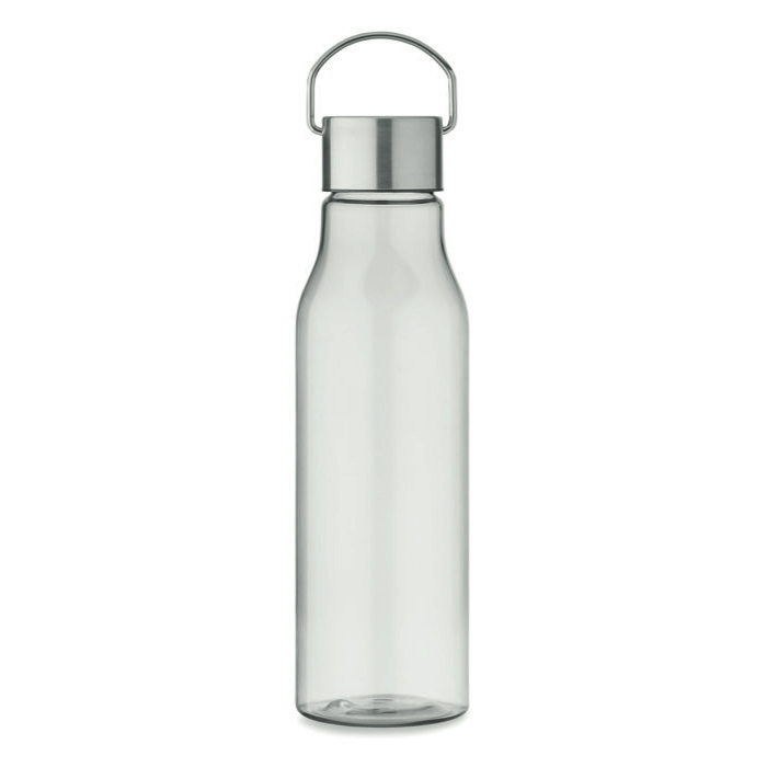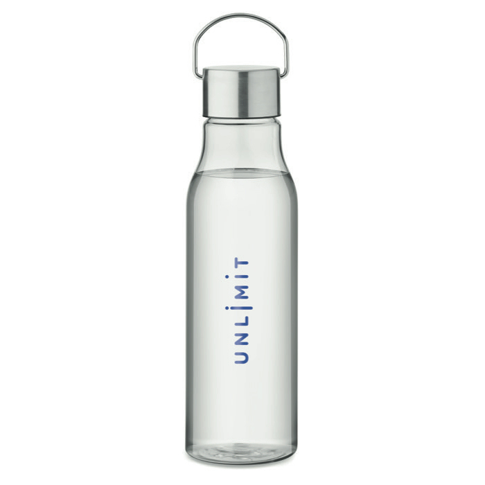 Botella de RPET (tereftalato de polietileno reciclado) sin BPA con tapón de acero inoxidable y asa. Diseñada para evitar fugas, esta botella tiene una capacidad de 600 ml, ideal para mantener hidratados a los empleados durante la jornada laboral. Disponible en varios colores, se adapta a la identidad visual de cualquier empresa. Su diseño antideslizante y antigoteo garantiza comodidad y seguridad en su uso diario. Perfecta para ferias o eventos corporativos, esta botella es una opción sostenible que refuerza el compromiso ambiental de su empresa.