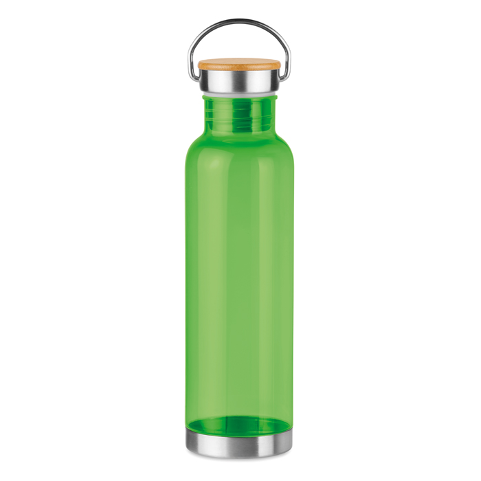 - Botella en Tritán con base de acero inoxidable y tapa de bambú