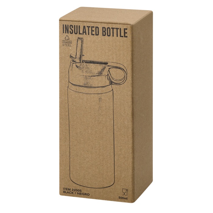 Considera una botella de acero inoxidable (90% reciclado, 10% acero inoxidable) antifugas con pajita para tu próxima campaña publicitaria. Este recipiente ofrece una forma cómoda y segura de hidratarse, ideal para el uso en la oficina, en eventos o durante actividades deportivas. Con una capacidad de 500 ml, es práctica para el día a día. Al personalizarla con tu logotipo, demuestras tu compromiso con el medio ambiente y la innovación. La tapa con asa de PP facilita su transporte, mientras que su doble pared aislada de vacío mantiene la temperatura. Suministrado en caja individual. Apto para lavavajillas. Tu marca se asociará con responsabilidad y eficiencia.