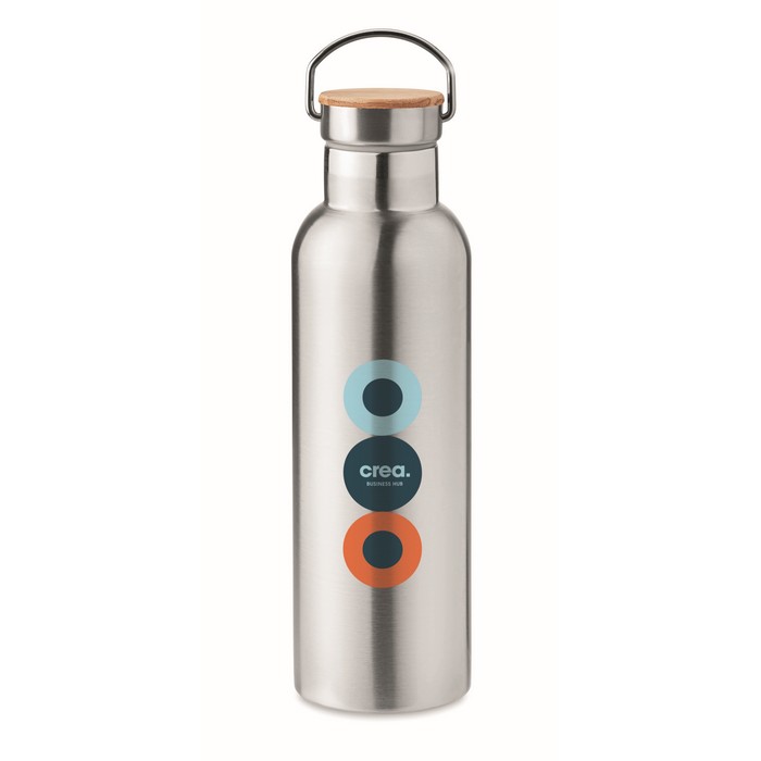 Haz que tu logotipo acompañe a clientes y empleados en su día a día, dentro o fuera de la oficina, con la botella Clip Med, un modelo de acero inoxidable con 750 ml de capacidad y sistema antifugas. Su diseño de doble pared con aislamiento al vacío permite mantener las bebidas a la temperatura óptima por más tiempo, mientras que su tapa a rosca hecha de bambú y con asa incorporada, eleva tanto el diseño de la botella como su practicidad y comodidad a la hora de transportarla. Es compatible con numerosas técnicas de personalización, con lo que podrás dar con aquella que mejor encaje con tu empresa y su imagen y valores.