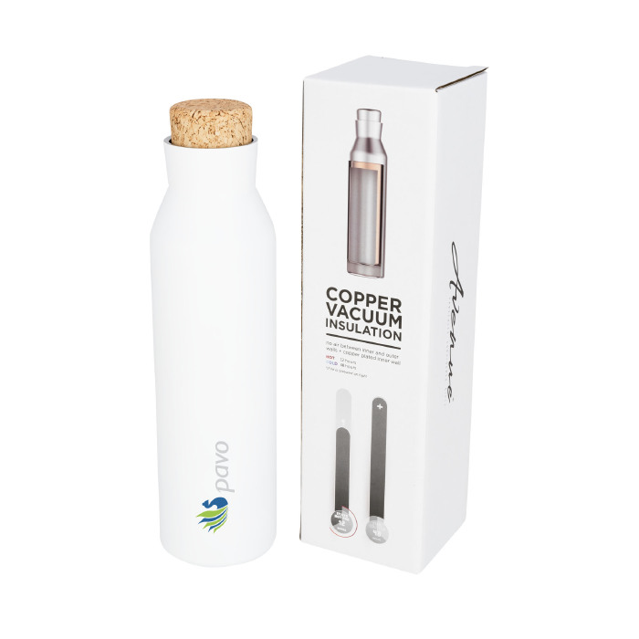 Botella publicitaria de acero inoxidable, diseñada con doble pared y aislamiento de cobre, ideal para mantener bebidas calientes durante 12 horas y frías hasta 48 horas. Su construcción evita la condensación exterior, y la tapa antifugas asegura un transporte sin derrames. El innovador tapón de rosca, que emula el corcho, añade un toque distintivo y se adapta a la mayoría de los portavasos de coche. Con una capacidad de 590 ml, es perfecta para el día a día. Se presenta en una elegante caja de regalo Avenue. Ideal para empresas que buscan un producto funcional y atractivo para promociones o regalos corporativos.