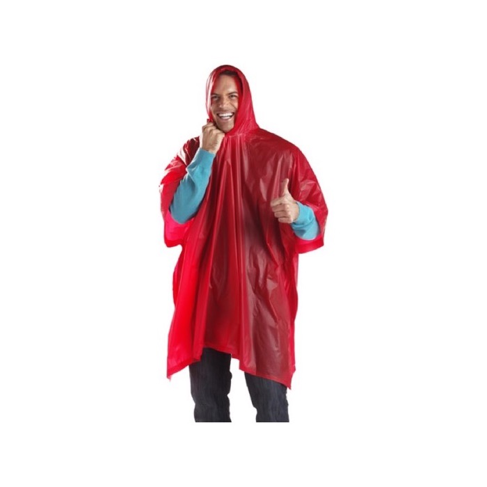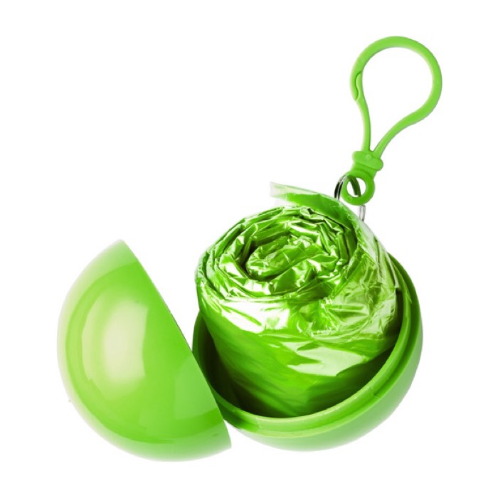 Poncho de plástico plegado en pelota redonda con mosquetón