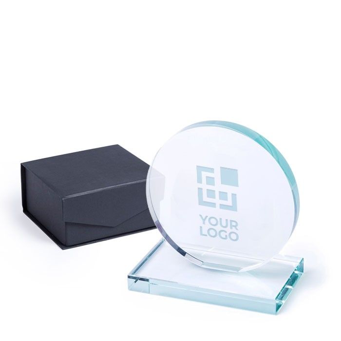 Cuando buscas reconocer el esfuerzo y la excelencia en tus eventos o competiciones, una placa trofeo redonda es una opción distinguida. Con un diseño circular de grueso cristal y una base cuadrada, destaca por su elegancia. Al personalizarla con el logotipo de tu empresa, elevas la percepción de valor del premio y refuerzas tu marca. Este objeto, entregado en un estuche individual, se convierte en un símbolo tangible de logro, motivando a los participantes y dejando una impresión duradera. Diseñada para marcaje a láser, te permite celebrar éxitos y asociar tu organización con la calidad y el reconocimiento, generando un recuerdo positivo de tu evento.