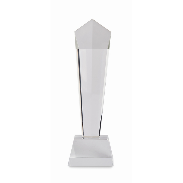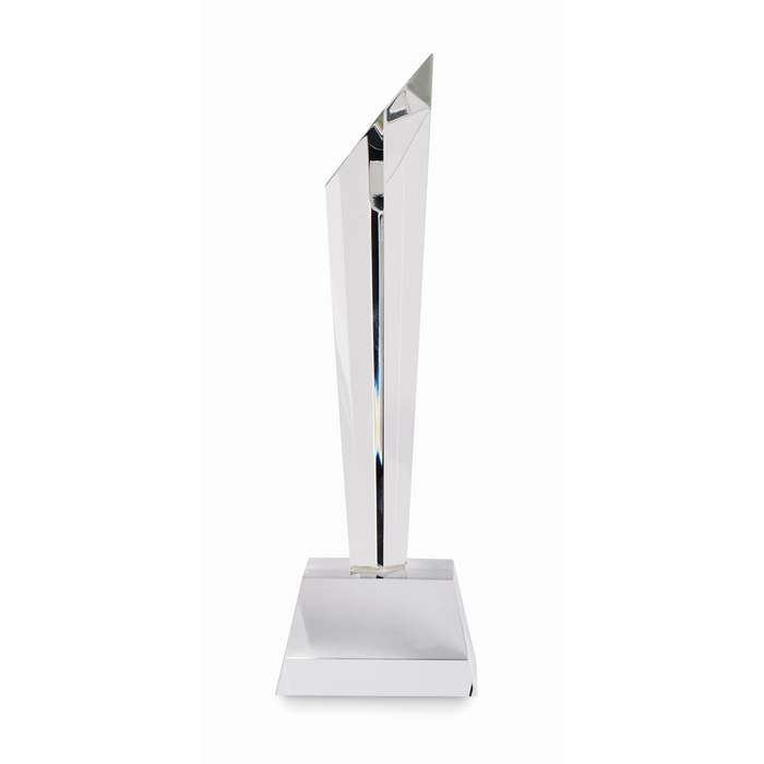 Trofeo de cristal en forma geométrica vertical en base de cristal