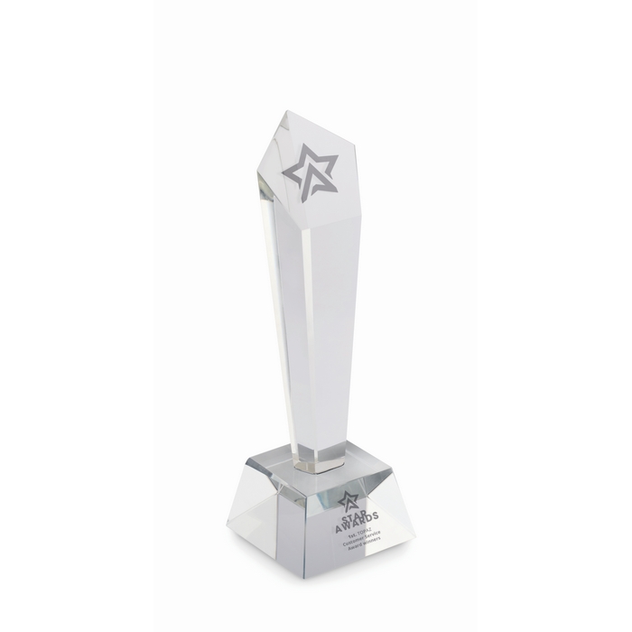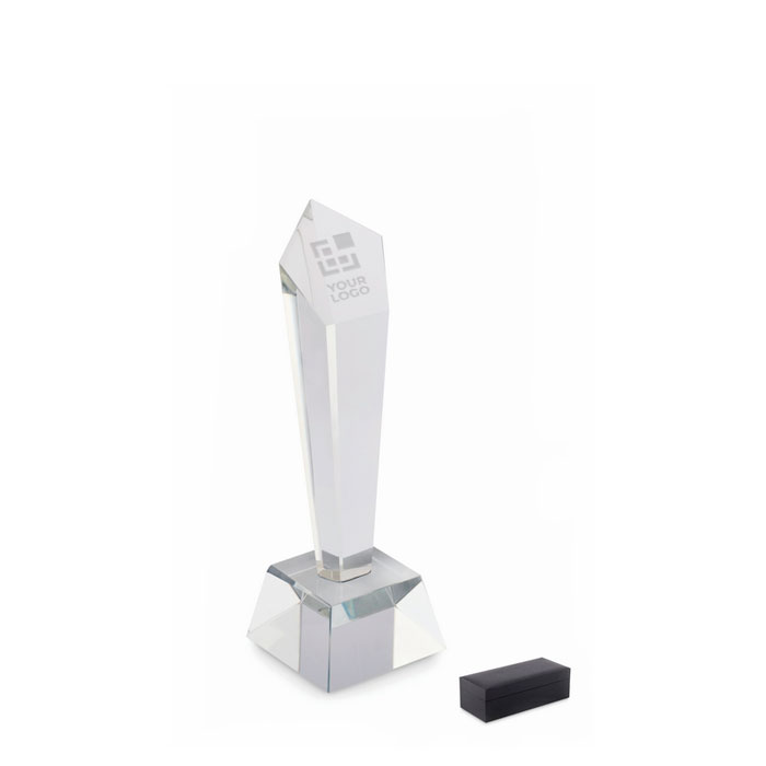 Para tus competiciones o reconocimientos corporativos, un trofeo de cristal con forma geométrica vertical te permite ofrecer un premio moderno y distintivo. Personalízalo con tu logotipo para que tu marca se asocie a la innovación y el prestigio. Su diseño contemporáneo no solo honra el éxito, sino que también se convierte en un elemento decorativo que luce en cualquier estantería. Al entregarlo, demuestras una valoración auténtica por el esfuerzo y el logro, creando un recuerdo que perdura y que realza la imagen de tu empresa. Además, viene presentado en una caja de regalo, añadiendo un toque de elegancia y cuidado en cada entrega.