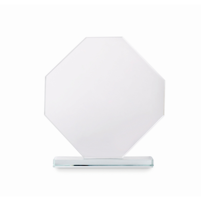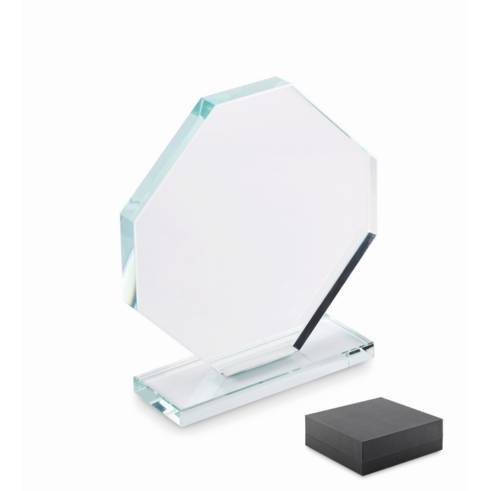 Trofeo de cristal en forma de octágono con base rectangular a juego