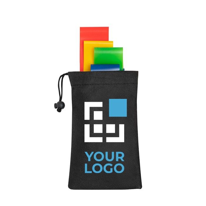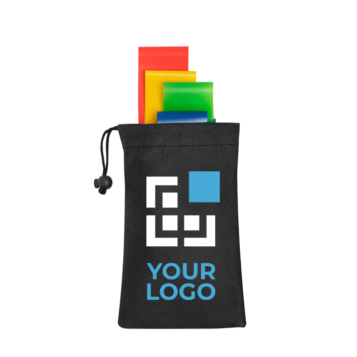 Juego de 4 bandas elásticas de gimnasia fabricadas en material resistente, presentadas en una práctica bolsa de non-woven negro. Cada banda ofrece un nivel de resistencia distinto: la roja es fuerte, la amarilla es de resistencia media, la azul es baja y la verde es muy baja. Estas bandas permiten realizar una amplia variedad de ejercicios adaptados a diferentes niveles de intensidad, ideales para entrenamientos personalizados. La bolsa es personalizable, lo que facilita su uso como herramienta de marketing corporativo. Además, el servicio Express asegura una entrega rápida, perfecta para empresas que necesitan soluciones inmediatas.