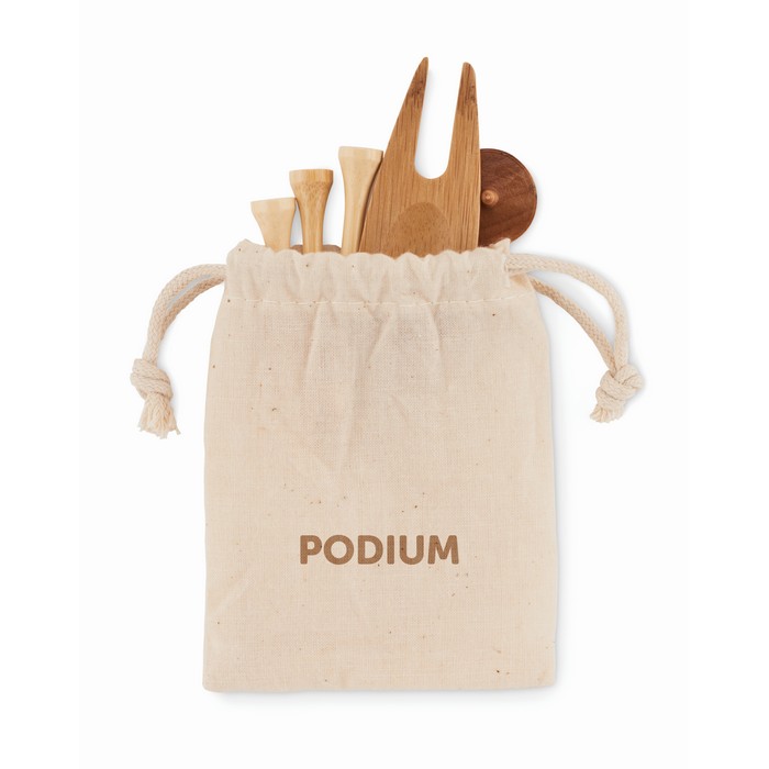 Set de accesorios de golf en bambú, compuesto por 6 tees, una herramienta de divot y 2 marcadores de bolas de madera, todo presentado en una bolsa de algodón orgánico. El bambú, al ser un material natural, ofrece una resistencia y durabilidad excepcionales, aunque el color del artículo puede variar. Los tees son ideales para cualquier tipo de campo, mientras que la herramienta de divot facilita el mantenimiento del césped. Los marcadores de bolas aseguran una identificación rápida y sencilla. Perfecto para empresas que buscan regalos corporativos sostenibles o para eventos de marketing relacionados con el golf. Servicio Express disponible para entregas rápidas.