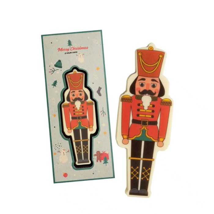- Chocolate blanco con diseño de cascanueces y personalización en empaque