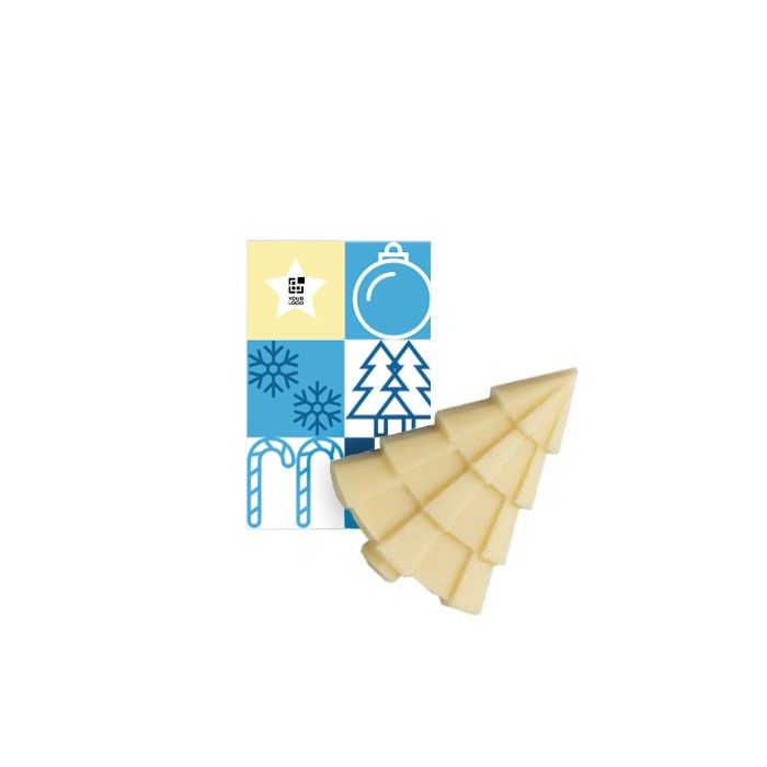 Árbol de Navidad de chocolate blanco (36% cacao), elaborado en Europa, es un regalo ideal para sorprender a clientes y socios durante las festividades. Incluye una tarjeta personalizable de 3,5 x 5,5 cm para añadir tu logo y mensajes festivos, haciendo de cada obsequio una experiencia única y memorable. Envuelto en film reciclable, este producto combina dulzura y sostenibilidad, reflejando un compromiso con el medio ambiente. Con una vida útil de 8 meses, cuenta con el respaldo del Certificado Cocoa Horizons y el Certificado Forest Stewardship Council (FSC), garantizando calidad y responsabilidad. Ideal para campañas de marketing o eventos corporativos.
