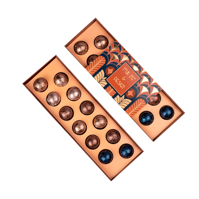 - Set de 12 pralinés con sabores gourmet y cacao seleccionado